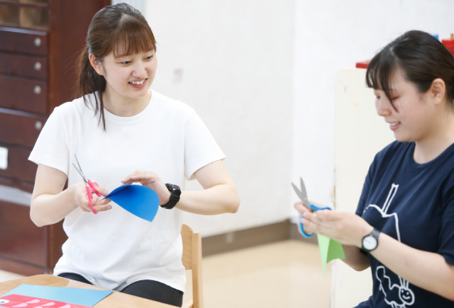 昨年からグループのリーダーになりました。スタッフに行動の狙いや意図をわかりやすく説明し、「私はこう思うけどあなたはどう思う?」といったやりとりを大切にしています。 お子さんや保護者の方にとって、より良い支援に繋がる方法を常に考えながら、職員同士で意見を出し合っています。