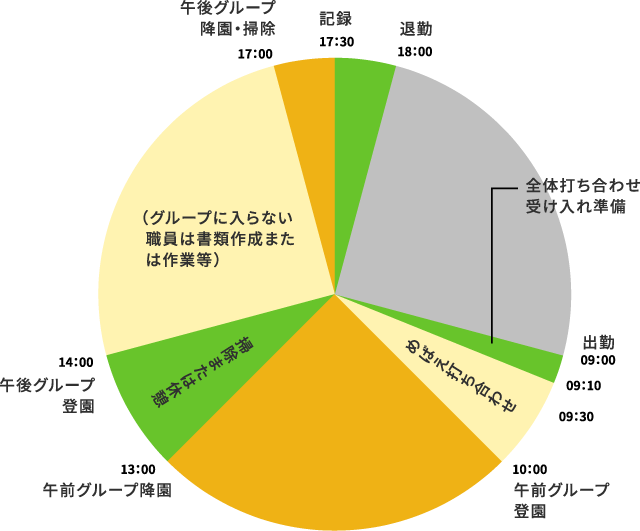 掃除または休憩 - 14:00午後グループ登園(グループに⼊らない職員は書類作成または作業等)